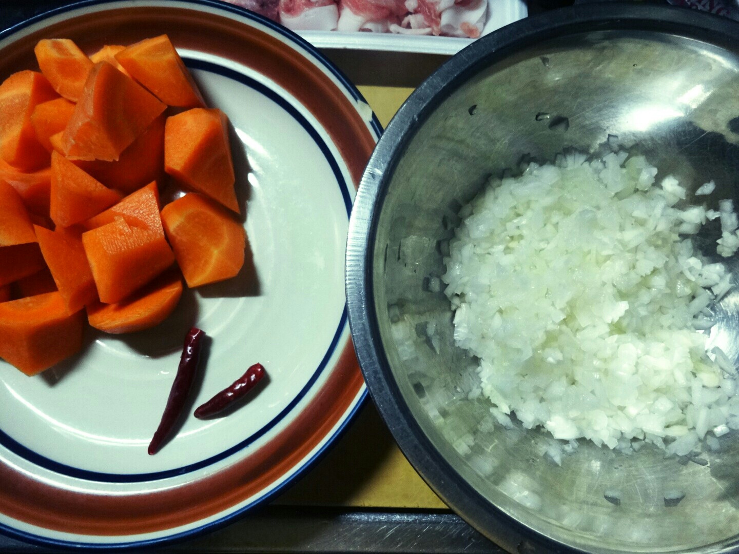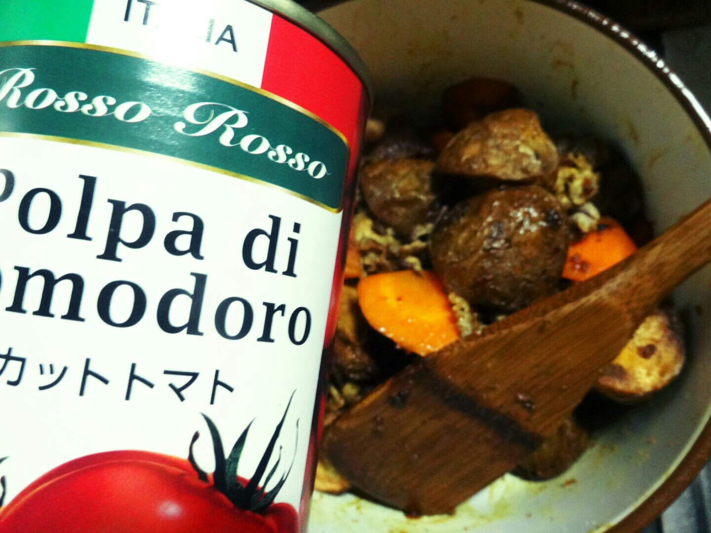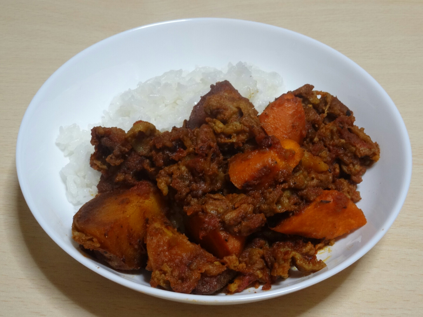 本格的なカレーとは何ぞや ★日常 料理 2014年06月22日 最近読んだ本に興味深いことが載ってました。カレーの本なんだけど、『2つのスパイスと1カケのカレールーでとびっきりおいしい!』と。自分は自分の作るカレーは母が作るカレーより美味しいと思ってる。おふくろのカレーよりもオレのカレーなのである。でも、スパイスから作ってるとかそんなことはなく、市販のカレールウをバリバリ使う。隠し味にソースやヨーグルトを使うとかあるけど、自分はやったりやらなかったりでその日の気分で変わります。ただ、変わらないのは肉や野菜を煮る時にトマトのホール缶をひと缶入れます。必ず。これは昔、NHKの料理番組で料理研究家の牧野哲大さんがビーフシチューを作る際にトマトのホール缶を入れてて、カレーでやったらどうだろう?とやってみたんですよね。辛さもだけど味がマイルドになって好きで入れてます。まあね、そんなにカレー作りに時間も手間もかけてませんねwでも、スパイスで1からカレーを作るってのもやってみたかった!(だけど難しいのは嫌だし、手間暇かかるのも嫌~)そこで前述のたった2つのスパイスと市販のカレールーを1カケでとびっきりおいしかったら自分としては理想的なんですよ。なので、早速挑戦してみました(・∀・)!前置き長かったけどwまず必要な材料は ・カレー粉 ・クミンシードスパイスはこれだけ。あとは仕上げにカレールーを1カケ入れる。これだけで本格的なカレーに!?と思うけど、他にもポイントがあるようで。もう1つのポイントになる"玉ねぎの蒸らし炒め"を作ります! と、その前の下準備。玉ねぎはみじん切り、にんじんはひと口大の乱切り、赤唐辛子は種を取りのぞいておく。ブタ肉は塩こしょうしときました。 カレーの主役のじゃがいもは四つ切りにして油で揚げておきます。いやあ、揚げたお芋とかめちゃ美味しそう!と思いながら揚げてたけど、揚げポテ+カロリー高めなカレーとか自分のお腹がポテっとしそうな…だが、それがいい!(よくないけどw お肉は油をひいて揚げるような感じで炒めてから、炒め終わったらフライパンから取り出しておきます。玉ねぎ以外の下準備が終わったら、やっとこ玉ねぎの蒸らし炒めを作っていきます! フライパンにサラダ油をひいて油があたたまったらクミンシードをJump In!火加減はフライパンがあたたまったら弱火にして、油にクミンシードの香りや薬効を溶かし出すように炒めていきます。 パチパチってクミンシードがはじけだしたら、みじん切りにした玉ねぎを入れる。注意点としてはこのとき煙が立つほど炒めちゃダメな模様。クミンシードの香りや風味が飛んじゃって、焦げっぽい味になるので× 玉ねぎを加えたら中火でサッと炒めます。テレビとかだとサッと炒めますって映像だからこのぐらいなんだなって分かるけど、本とかで文字で書かれてるとサッとってどのくらいだよぉ!と思っちゃうのは自分だけではないはずwサッと炒めたらフタをして弱火で蒸らします。焦げないように時々フタを開けてじっくり炒めます。時間ある人は一時間じっくり、時間ない人は20分間頑張るべしべし。一時間炒めると素晴らしくおいしいカレーを作る元になるそう。 20分ほど炒めた状態がこちら。忙しかったので20分にしときました。(野球観戦的な意味でw) 冷凍保存も効くようでジップロックなどに入れて冷凍しとけば一か月保存できるそう。時間ある時にでも一時間炒めたの保存しといたら、次に作るとき楽チンだねぇ。 忙しくなるはずがホークスの投手陣が早々と焦げ臭くなって大差ついてしまったので40分ほど炒めましたw どうやら自分が作るレシピは赤唐辛子と玉ねぎを一緒に炒めるのが正解だったようです。基本は入れないみたいだけど、気がついて慌てて入れましたよ… 玉ねぎの蒸らし炒めができたらそこにショウガとニンニクのすりおろしを入れて、ひと口大の乱切りにしといたニンジンを加えて2分ほど炒める。炒め終わったら、炒めておいたお肉、揚げておいたジャガイモを入れます そこにカレー粉(大さじ4)を入れて香りが立つまで炒めます。自分は写真で分かると思うけど煮ていく段階でフライパンから鍋に変えたけど、手間暇かけた玉ねぎの炒めたうまみとかもフライパンについてたと思う…。なので、玉ねぎ炒めた鍋orフライパンで煮た方がより美味しいと思います カレー粉の香りが立ってきたらカットトマトの缶詰を加えて、弱火で1時間煮る。ビックリしたのは水とか加えないでそのままトマトの水分だけで煮ていくとか! この程度しか水分なくて焦げたりしないのかな。と心配になってしまいましたよ 1時間煮た状態がこちら。と言いたいところだけど30分煮た状態で火を止めました。ウチのコンロっておバカでして…細かい火加減が苦手で、弱火とかにして煮ようとすると数分もすると勝手に火が消えて、ピーピー鳴り出す仕様で…ちょっと水加減がこれでは1時間もたなさそうだったので30分煮です。家々で
