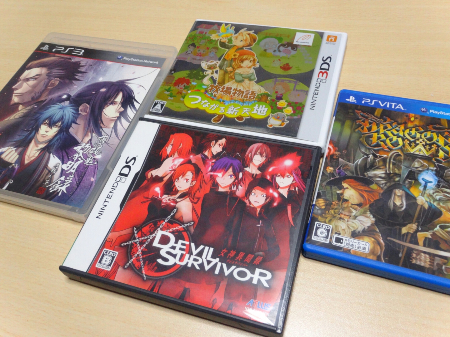 積み深いゲーマー ★ゲーム 雑記 2014年03月25日 積みゲーって未開封でやってないゲームなのか、はたまたクリアまで遊んでないゲームなのか?自分はゲームはクリアまで遊びたい、かつ気に入ったらトロフィーや実績も取りたいって感じ。去年も積みゲーのこと書いたけどちゃんと消化できたのかふり返ってみてみませう。・真・女神転生 デビルサマナー (PSP)クリア済み。嵌って続編のソウルハッカーズもクリア。ライドウVitaはまだか!・東京鬼祓師 鴉乃杜學園奇譚 (PSP)未クリア。積んでる間にもう魔都紅色幽撃隊が出そう…・太閤立志伝Ⅴ (PSP)未クリア。UMD版所持だけどDL版買ってPSPgoに入れたい目論見・世界でいちばんNGな恋 ふるはうす (PSP)・My Merry May with be (PSP)・乙女的恋革命ラブレボ!! Portable (PSP)未クリア。ギャルゲーは去年DCの君が望む永遠、世界観繋がりのマヴラブ、去年書くの忘れてたメモオフ6をクリアしたのでこれらは手つかずのまま・薄桜鬼 巡想録 (PS3)クリア済み。めちゃめちゃ泣けた。乙女向けではなく男子にこそやって欲しい・ニーア レプリカント (PS3)クリア済み。こちらも涙腺崩壊ゲー。近年遊んだRPGだと一番好き。音楽も◎・ロロナのアトリエ (PS3)未クリア。積んでる間にグラフィックリファインした完全版が…・child of eden (箱○)・エンド オブ エタニティ (箱○)・ブラーレーサーズ (箱○)未クリア。EoEは遊んでみたいのに戦闘システムを理解できない阿呆の子以下、箱○の未開封だった積みゲー・アランウェイク クリア済み。まあまあ楽しかった。ゲーム内で流れる洋楽がカッコいい・11eyes ・TOO HUMAN ・レゴ バッドマン ・まもるクンは呪われてしまった! ・ストライクウィッチーズ 白銀の翼 未開封。TOO HUMANとかオンライン人いるのだろうかw レゴバッドマンもだけど遊ぶ人いたら開封すると思います。そこのキミ一緒にどうだい!去年は新作買ったの少なかったと思います。特に箱○が躊躇で買ったのはギアーズのJudgementとDOA5Uぐらい。あと旧作でマヴラブ。箱○は積みゲーもいっぱいあるので気になるタイトルあってもスルーした感じですね。地球防衛軍4、スプセルブラックリストはいつかやりたいトコロ。 最近の積みゲー。と言ってもデビサバは随分前のだけど。アニメ放映の波に乗ってデビサバ2をクリアして終盤で詰んでるデビサバ再開したけど、2の快適性になれた自分には無理だった…。好きなシリーズなのでクリアしたいけどDS版は厳しい。快適になってるらしい3DS版を安く見かけたら買ってみようかな。 PR