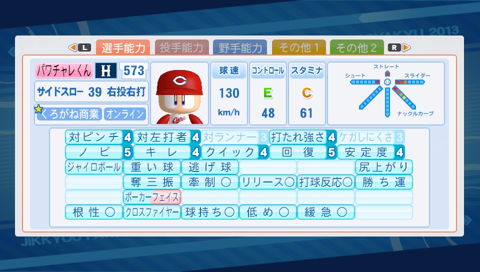 スーパーエースを目指して! その3 ★ゲーム 実況パワフルプロ野球 2014年04月07日 62人目で3度目の天才選手が出ました♪ これ出たの土曜日なんだけどやっぱり土曜日は天才出るまで粘った方が良いですね。野球観ながら片手間でやって30回ぐらいかな?時間にしても一時間も掛からなかったです。 投手だと2人目の天才型ですが前回の天才と比べると今回の方が球速早いので強い!ただ、自分自身スーパーエースは天才+オペ成功じゃないと無理だと思ってるので。うーん…オペは博士持ってないので助っ人頼りなんですよね。この時は居なかったので天才出てもまた無駄にしちゃうかなと…(助っ人はアフロ猪狩でした) と、前回の天才投手の時に気づいたけど今回も投手能力だけじゃなく野手能力も高い!初期に自分が作った野手より最初っから強いもんねぇ変化球もフォークとシュートとイマイチかなと思ったのでここで妙案が頭の中を…二刀流を作ってみようホークスファンだけど日ハムの大谷くんはロマンあると思っております。個人的には野手メインで行った方が良いと思ってるから、先発じゃなくて野手として試合に出ながらピンチになったら中継ぎ、抑えとして外野から颯爽とマウンドに行くって方がカッコいいと思うけどね。なので、自分は中継ぎとして使う方向で作ってみました! 阿畑のR入れてたのでオリジナル変化球をゲット♪ フォークのキレを上げた感じに作成。それと、自分が投手作ると得意な変化球を1つがーっと上げて7にして後はちょっぴりの2球種の投手が多いので3~4の変化量の変化球を3種類(奪三振)にしてみました。対人だと結構強いと感じたしね。…ただ、球種が分かりやすくてスローカーブ4、オリジナル5、シュート1の方が良かったかも。オリジナルの3があんまり曲がらなくてイマイチ…w 野手能力。とにかく走力点が不足…。文武で守備LV5でも全然でした朱雀からレーザービームのコツをもらってたので付けてたかったけど走力足らずに覚えさせられなかったのが残念無念。が、走力以外の能力は高めに出来たので結構お気に入り選手になりましたよ。 デッキはこんな感じ。アフロ猪狩のアフロの中に手を入れるイベントは成功したことないw とにかく走力点が足らなすぎるので後半守備練習の得意なキャラ(田中山,進くん)とブースト目的と変化球点も欲しかったので帽子なし山口を投入。阿畑と朱雀は欲しいものもらってたしね。が!守備タッグは一度も起きぬまま終了…ぬーん田中山が空気すぎた なかなか思い通りには作れなかったけど投手でホームラン打つ楽しさったら! PR