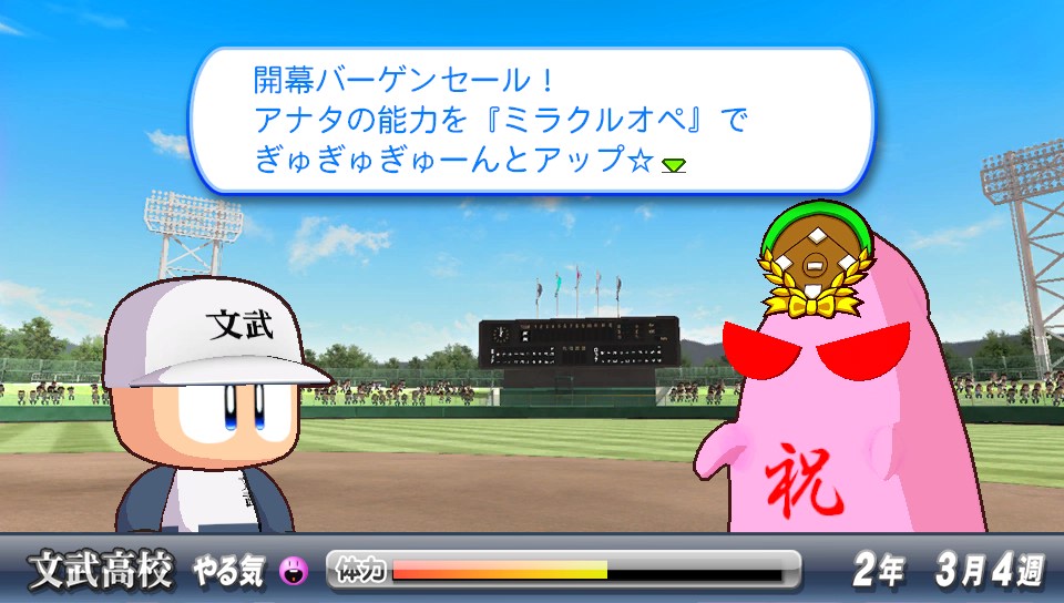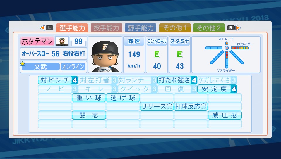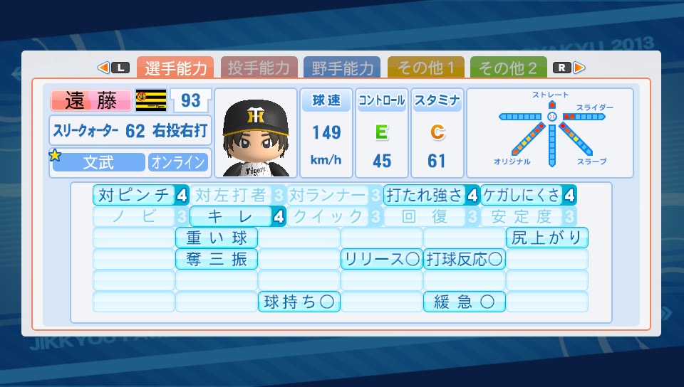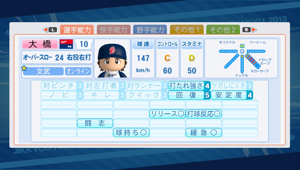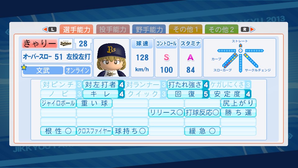 開幕ゲドーくん ★ゲーム 実況パワフルプロ野球 2014年03月31日 開幕ゲドーくんやっと成功しました。毎回お弁当食べるだけだったのでどんなイベントなのかナゾだったけど、節分の時と一緒ですね。能力がS(100)になるかG(1)になるか。なかなかゲドーくん自体に合えなかった(7回に1回程度の遭遇率)けど、最近は3回に1回は会える気が。確率変えたとは思わないけどイベント的には結構大きい。野手で失敗したらリセット確定だけど投手なら失敗しても、そこまで痛くない。スタミナが1になっても中継ぎ、抑えに出来るし。 コントロールをチョイスして成功した選手。成功率としては3回に1回成功といった感じでしょうか。往年の星野伸之投手をイメージして作ってみました。今回の2013だとコントロール大事だけどSともなるとすごい。自分の操作どおりに投げることが可能で「同じ球じゃない、さっきとはボール1個分ずらしてる」などと最近マイブームのダイヤのAのキャラみたいなことをして楽しんでおりますw相手打者のパワーを下げる重い球か対ピンチか迷って重い球つけたけど球速遅いと効果はイマイチかも。芯で捉えられるとやっぱり飛んでしまうので ハイパーオペ失敗投手。オリジナル変化球の名前は"不知火"SFFの速さを上げてて結構エグいです。シュート回転はマイナス能力だけど使えないかなと付けてみました。荒れ球を対人でも使えたら良いけど、対人だと投球カーソル出ないのであんまり意味ないのが残念なところ。 あ、ログインボーナスで久しぶりにSRチケットをいただいたので引いてみたら佐久間が出ました。どうなんだろう?微妙なのかなw1枚も野手のSR持ってなかったから良かったけど。編み物趣味なところは似てて好きだけどそんなにキャラ立ってないよね… ようやく完成した盗塁5持ち。盗塁5の能力を知ってビックリしたので前から作ってみたかったんよね!"盗塁5"走者として塁に出たときに相手投手の投手能力を下げ、スタミナを多く消費させる。盗塁5って盗塁4より盗塁するのが上手くなる能力だと思ってたw能力的には普通だけど佐久間and木崎、美崎and矢部君のコンボイベントなどで流し打ち、内野安打○、盗塁4が取れたのが嬉しい。SR佐久間の金特能力"芸術的な流し打ち"は手に入らなかったけど代走にも代打にも使えそうで◎スーパーエースは遠いですね。ぶっちゃけ出来る気がちょっとしないw PR
