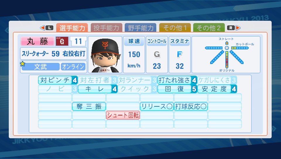 スーパーエースを目指して! その1 ★ゲーム 実況パワフルプロ野球 2014年03月29日 パワプロ2013、オールA選手出来てちょっと落ち着いた感じだけどちょこちょこ遊んでおります。オールA選手作成のトロフィー取れたので投手版のオールA選手作成である"スーパーエース作成"をやってるけど、やっぱりこっちの方が条件とか厳しいし難しいですね… 最近作った中で一番強くできた選手。先週の金曜日に作ったんだけど凡才、博士なしでも結構強くできました。金曜はコツを教えてもらえる確率がUPだけど新しく配信された信長が強い。何のコツ教えてくれるのかわからないほど一緒に練習ばかり起きて、筋力点もかなり上がるなので信長様様でした。(ブースト松倉スタミナ↑) 金特出てビックリした選手。緩急○の上位版の変幻自在所持。全然知らなかったんだけど美崎ちゃんのデート完走で野手だと弾道とチャンスのコツもらえるけど、投手だと弾道と低確率で変幻自在付くんだね!まあ、その美崎ちゃんからもらったチョコで虫歯になり虫歯治らずに終わったため球速がひどいことになっちゃったけどw 威圧感持ちピッチャーを作ってみたくて作成。最近は作った選手のみのアレンジチームを使ってCPUと対戦するのがマイブームなんでCPU威圧してやるぜ!と使ってるんだけど、なぜか効果が発動しない。発動しないと微妙な選手なので困っております。発動条件なんなんだろ? 最近嵌ってるオリジナル変化球持ち選手の一人。上の威圧感持ちPともう一人総変化量17のPの抑え2枚看板でいこうと思ったら中継ぎも先発枠も厳しく感じたので先発、中継ぎ、どちらもできる選手を作りたいなと作成。オリジナル変化球はHシンカーを縦方向によく落ちるようにして攝津のシンカーをイメージして作ったけど、使ってみるとほとんどHシンカーのままw オリジナル変化球持ち二人目。ストレートを浮き上がるようにしてます。あがって~のぼって~と言った感じだけどこれが強い!能力的にはイマイチなんだけど対CPUだとこの選手が一番抑えちゃいます。ゆ~れる~と言った感じのナックル1も最近強いと感じる。ただ、オリジナル変化球は未だにR阿畑でのみ成功。SRの方が効果高いらしいけど全然最後まで完走したことない。この辺は改善して欲しいトコロ。 あ、投手作りメインなんだけど助っ人が野手向けすぎたので久しぶりに野手作ったら土曜日の恩恵か天才型が!初期能力からAとかCとか強すぎた!助っ人が友沢なのとまたしても守備職人作りたさに村雨チョイスの、あとは得意練習が肩力だったため有村を入れてスタートしたけどまさか天才が来るとはなんとも勿体ない。むむむ…研究は 精神練習が上がった 精神練習が上がった 祭りでゆうちゃんを手術してあげたくなる感じだし、練習も村雨も友沢もコツを全く教えてくれずなおかつ戦国高校に負けるわで完成したら残念な選手になってました…。 天才選手の無駄使い\(^o^)/