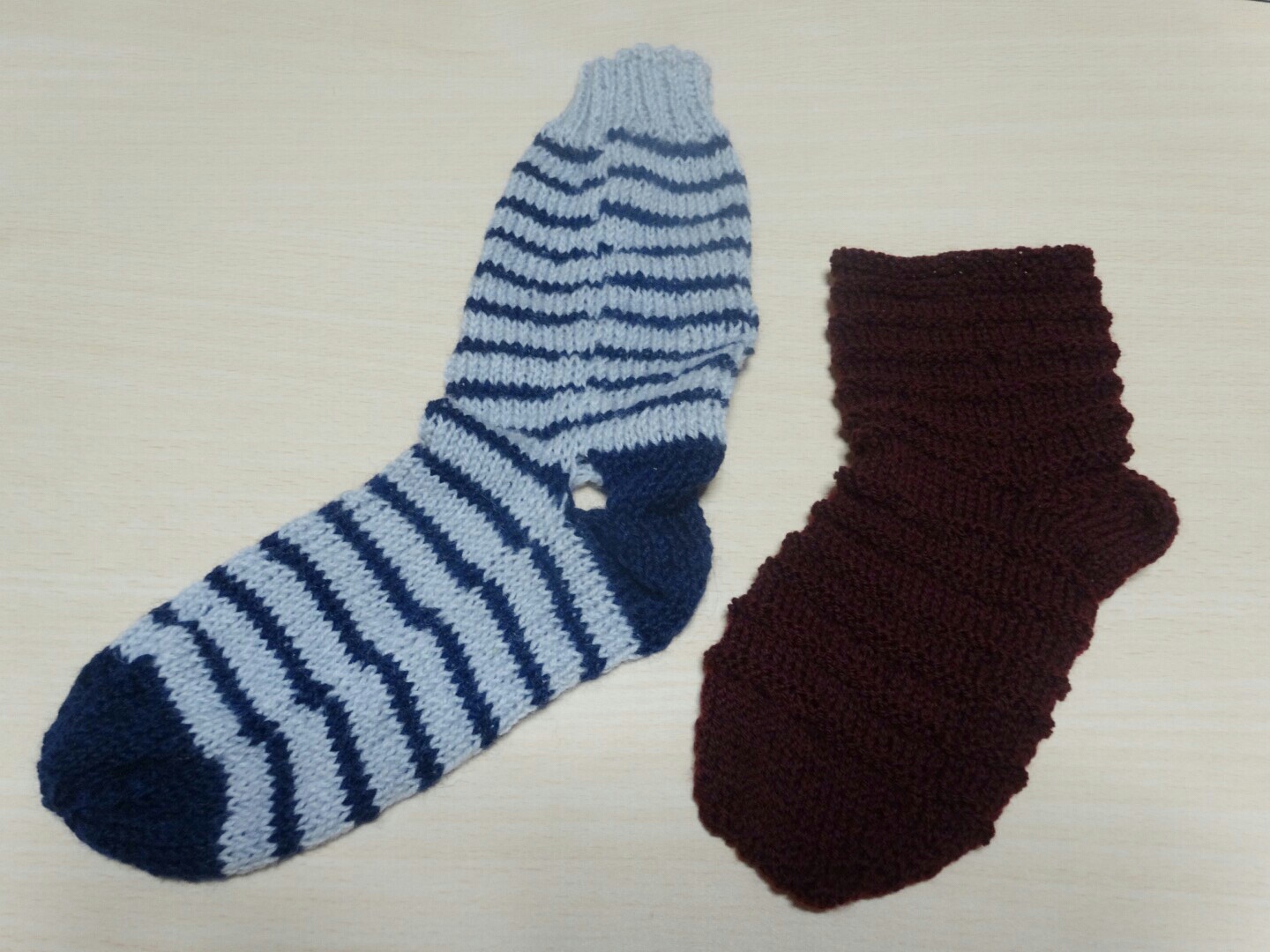 靴下リベンジ!? ★編み物 靴下 2014年06月10日 やっとこ編んでいたボーダー風のくつしたが編み終わりました。大分時間掛かった気がしますね。引き返し編みの直前まではもう随分前から編み上げていたのですが、引き返し編みの恐怖に己が引き返しておりましたよ…色んな本や動画などを見て引き返し編みには目数が分かると良いのだなと目数リングを購入したり。その結果、なんとか今回は前回のように大穴が開くこともなく、無事にかかと部分を編むことが出来ました! ただ、大穴はなくとも小さい穴はありまして靴下編みの難しさを再度実感。(小さい穴なら補修が効くので大丈夫ですが) でも今回はいい感じで引き返し編みを出来たので満足してる。が、前回苦労しなかったので舐めてたメリヤスはぎでイマイチなデキになってしまったかな… つま先の部分が丸くならず 沖縄にいるお魚の口みたいなことに下あごが出てる感じに見える(ノД`)・゜・。〔前回編んだ靴下との比較〕 うわっ…私の靴下、大きさが全然違いすぎ…?(だいたい) 編み図どおりに編んだのにおかしいな。本当はボーダー風くつしたの方が大きくなるはずだったんだけど…多分、くしゅっとしたデザインだからかな。うん、きっとそうだ。本来ならもう1足編んで完成だけど今回も片足で次の作品に向かいます。靴下編み楽しいけど片方編んだら飽きてくるねw まあ、今は練習してる段階なのでOKとしませう。母上の誕生日のプレゼントには片足だけの靴下にならないようにしないとだけど…\(^o^)/次に編む予定は初の模様編みに挑戦してみるつもりで、ドット柄の靴下を編むつもり。ネコのスマホポーチとかかぎ針はご無沙汰なので編んでみたいし、あると便利そうなミトンなんかも編んでみたいで、これから夏だけど編み物熱はグングンと燃えたぎっております! 前に本屋さんで見かけて気になっていた大図まことさんのクロスステッチの本も買ってしまいました。編み物だけじゃなく縫い物にも興味出るとは数年前の自分からは考えもしなかったw レトロゲーマーなら見てるだけで嬉しくなっちゃうデザインがたくさん。クロスステッチってやったことないし、縫い物は玉止めすら出来ないレベルだけど、ミクロやPSPgoなどを入れとくポーチにドットキャラを縫えたらステキかなと!縫い物もがむばっていきたい所存。