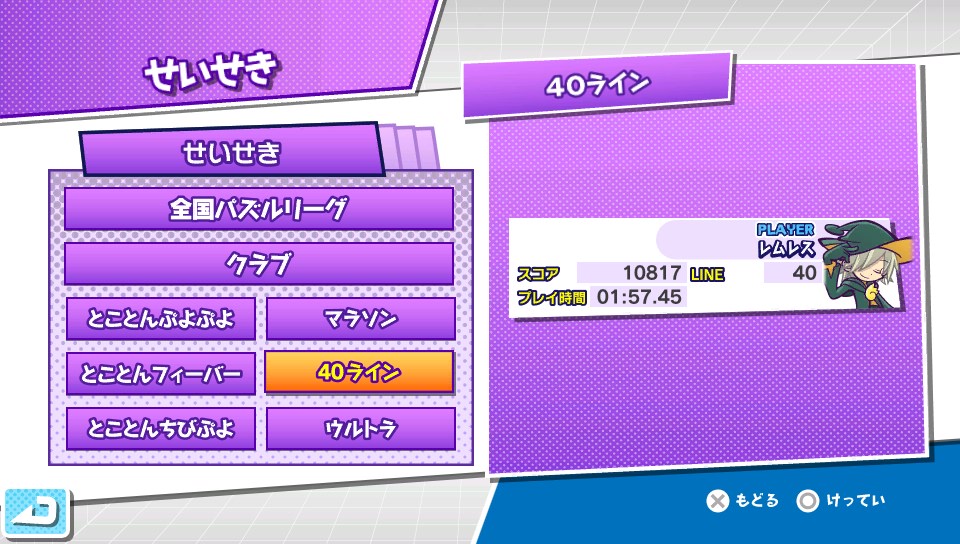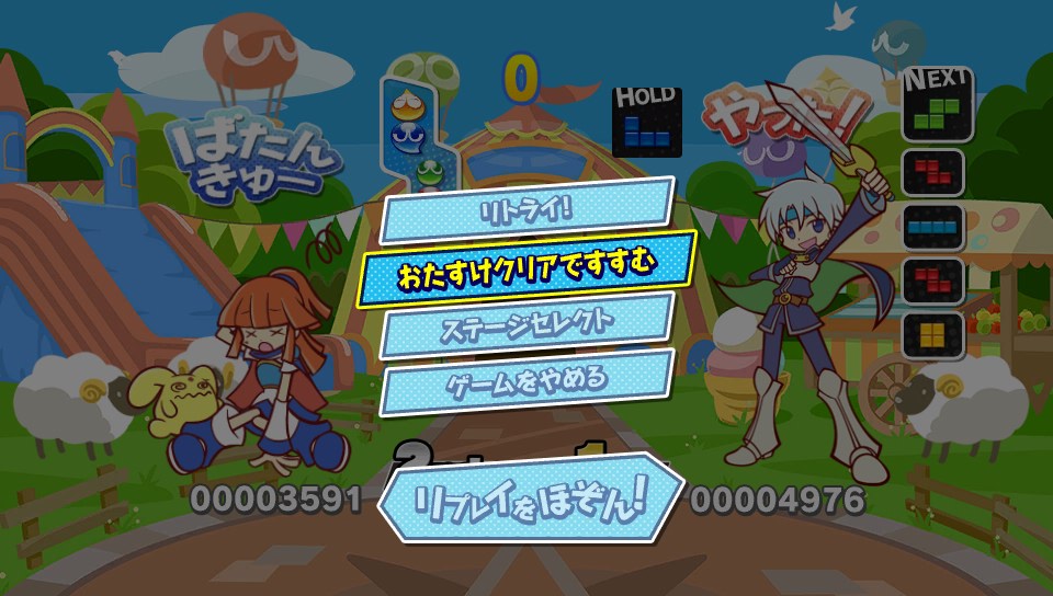 ぷよっとテトリス ★ゲーム Vita 2014年02月21日 ぷよぷよテトリスのアドベンチャーモードクリアしましたっ!プレイ時間は5時間程かな。自分はぷよぷよ初心者で中盤辺りから苦戦したけど、4回負けると"おたすけクリアですすむ"という項目が出てきて先に進むことも可能なのでパズルゲーム苦手な人でも安心な仕様。 お話としては面白くない(キッパリ)けど出てくるキャラクターがすごくかわいかった。ウィッチとかかわいすぎ!個人的には女の子のかわいいキャラは多いけど、男子のカッコいいキャラが少ないのが残念。くぅ~んとか鳴くおじさんとか出てくるけど絶対いらなかったと思うw 逆転裁判4のハミガキ氏に続く個人的生理的に無理なキャラでしたヨ… ぷよテトミックスとスワップどっちも面白いなあと思ってたんだけどアドベンチャーモードやって"パーティー"も楽しいなって思った。よくあるアイテムありのルールで画面が暗くなってライトの明かりでしか見えなくなるやつとか、あとは回転禁止のアイテムとかあるんだけど、その中でもテトリミノの形が変形するのが恐ろしい…!もうこんなんどうしろっていうミノが落ちてきて、キレイに積んでたテトリスが無残な形になることうけ合い。対戦したらすごく盛り上がりそう。 あと最近はテトリスの40ラインをちまちま遊んでおります。2分切ったら初心者らしく、さすがに余裕だろうと思ったら2分30秒とか…頑張ってやっとこ2分の壁を破ったけど、やってる自分としても遅いって感じるレベルなのでもうちょっと早くなりたいトコロ。そういえばテトリスDSに嵌ってた頃は夢でテトリミノが降ってきたりしたけど今回はまだ見てない。もしかして、このお腹のぷよぷよも夢なのかもしれない。やだ、こわい…