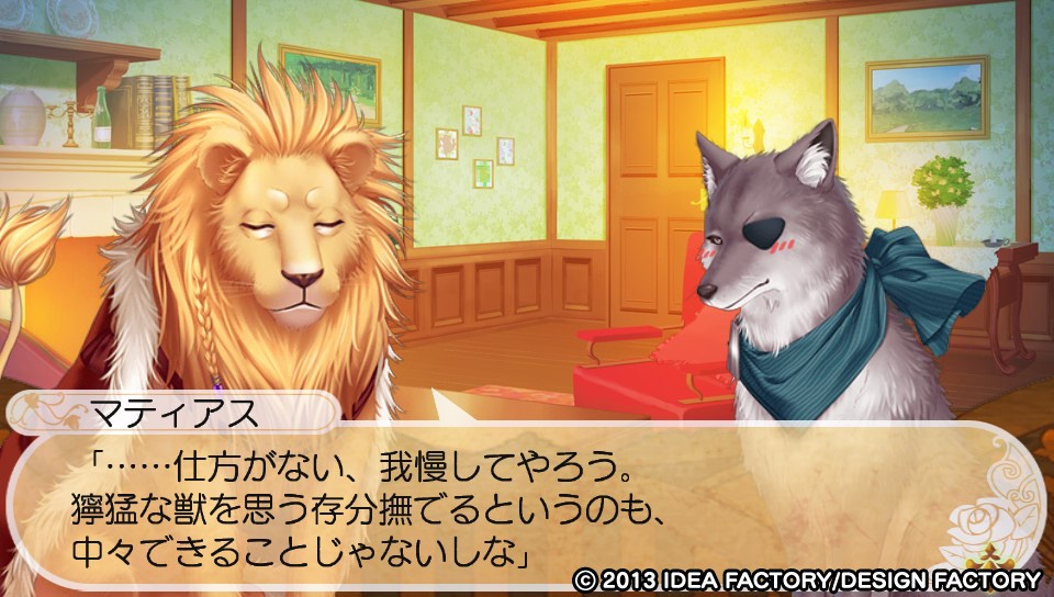 オレは猛獣使い王になる! ★ゲーム アドベンチャー 2014年02月12日 猛獣使いと王子様のアルフレートルートをクリアしました。プレイ時間は10時間もないような?結構短いと思います。でも消化不良感もなくちょうどいい長さ。全体やったらわからないけどw物語の序盤は進行がほんわかとのんびりで嵌れなかったんだけど中盤から終盤に掛けては展開が慌ただしくなってきて、どうやっちゃうの!?とガチ嵌まりしておりました。策略、陰謀、戦争、歪んだ愛情など好きな人にはオススメ。 最後の展開は正直読めたけどそれでもぶわぶわ泣いてしまった…。それほどシナリオというか台詞と音楽がよかった。聞いたことないタイトルだしフリープレーだしと正直舐めてたけどフタを開けてみたら良乙女ゲーでした。ルートによって展開も変わるのかまた楽しみなところ。次はルシアルートを攻略してみようかなあ。アルフレートルートはシュールな世界観のギャグ?もあったけどはてさて。 シリアスからギャグまで網羅した猛獣使いと王子様、この先どうなっていくのか楽しみである。 PR