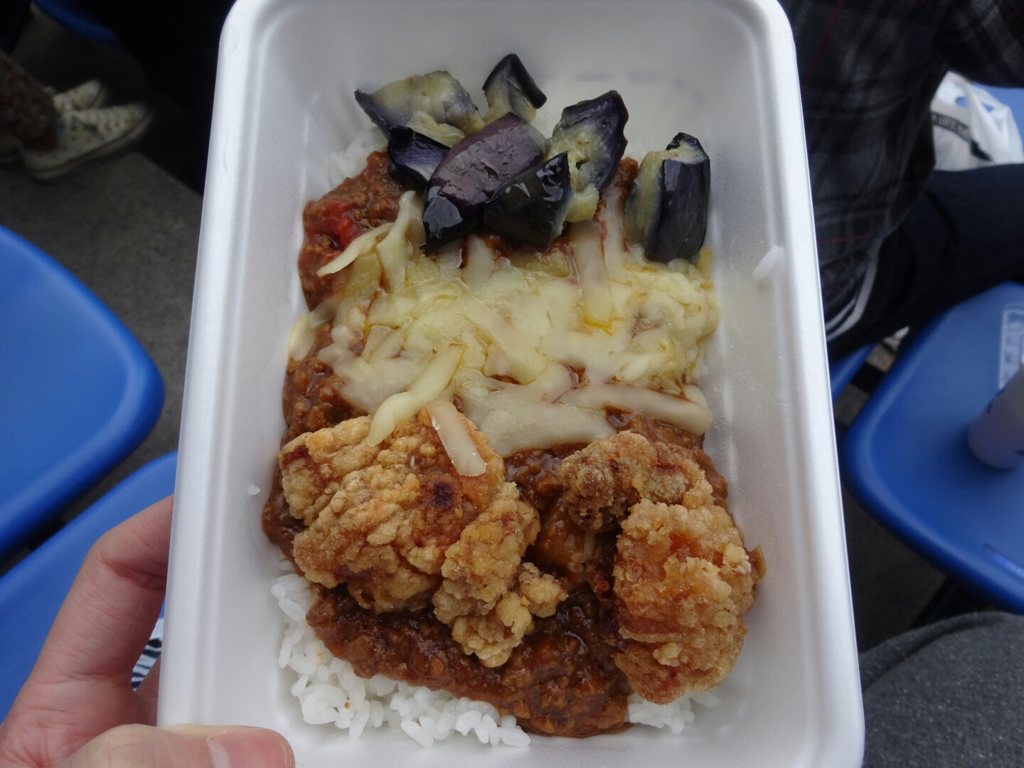 いざマリンスタジアムへ ★外出 その他地域 2014年04月20日 今日は今年開幕して初めてのプロ野球を観てきました。試合はQVCマリンフィールドでロッテvsホークス戦。去年も何回か来ましたね。今日はパトレイバーとコラボしたイベントもやってて球場の前には高さ8mのロボット(イングラム)が登場するとか。それも楽しみだったんだけど… 自分が着いた時は寝てたちょっと前にTwitterで立ってる姿を見たのにタイミング悪すぎたイングラム展示以外にも主役を演じる真野恵里菜さんの始球式やシバ シゲオ役の千葉繁さんも来てたりと賑やかでした。 若いお姉ちゃんたちが「誰あれ?知らない」と言っててジェネレーションなんちゃらをひしひしと感じた。名前知らなくても声は聴いたことあると思うんだけどなあ。レレレのおじさんだよ!レレレの!って、分かんないよねw そして!球場といえばスタジアム飯!QVCといえば前回来たときにとっても美味しくてファンになってしまった東京スタジアムカレーをまた食べるのを楽しみに来たんだけど、出店してるのを見つけられず… カレー欲が高ぶってたのでミートカレーのお店にしました。色んな種類のカレーを取り扱ってるみたいだったんだけど、ほとんど売り切れでホウレン草と温玉のカレーと6種類のトッピングの中から3種類を自分で選べるスペシャルカレーBOXの2つしかなかったので、スペシャルな方をチョイス。 スペシャルカレーBOX 680円うーん、写真と随分違う!よくよく考えたら写真は6種類のトッピングを全部乗せた写真だったのね。温玉、ナス、チーズ、バジルトマト、からあげホウレン草の中からゆた。的トッピング(ナスチーズからあげ)にしたけど彩りが残念な感じになってしまったwお味の方は無難かな。みんながみんな10点満点で7点をつけそうな味。個人的にはからあげが固く揚がってたのと東京スタジアムカレーと比べちゃってちょっと残念でした…肝心の試合の方は今季ワーストの試合でしたね。ロッテの先発石川歩投手もよかったけど、初回にミス連発で先制点取られたので今日はダメだなぁという雰囲気が最後まで続いたようなゲームでしたね…。ただ、今回は座った席がすごく良くて周りに座ったファンの人たちがよく声を出して応援していたので、自分も声が枯れるほど応援できました。現地行ったファンの方々お疲れさまでした! PR